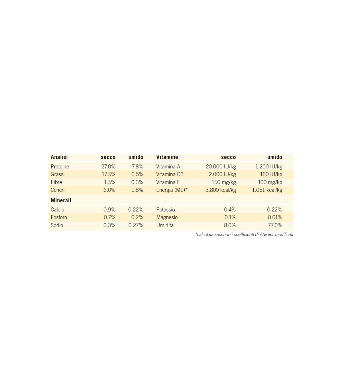 Secco: cereali (mais, frumento), carne e derivati di origine animale (maiale, pollo), oli e grassi (strutto), estratto di proteine vegetali (glutine di mais), minerali, lievito, prodotti vegetali (inulina).